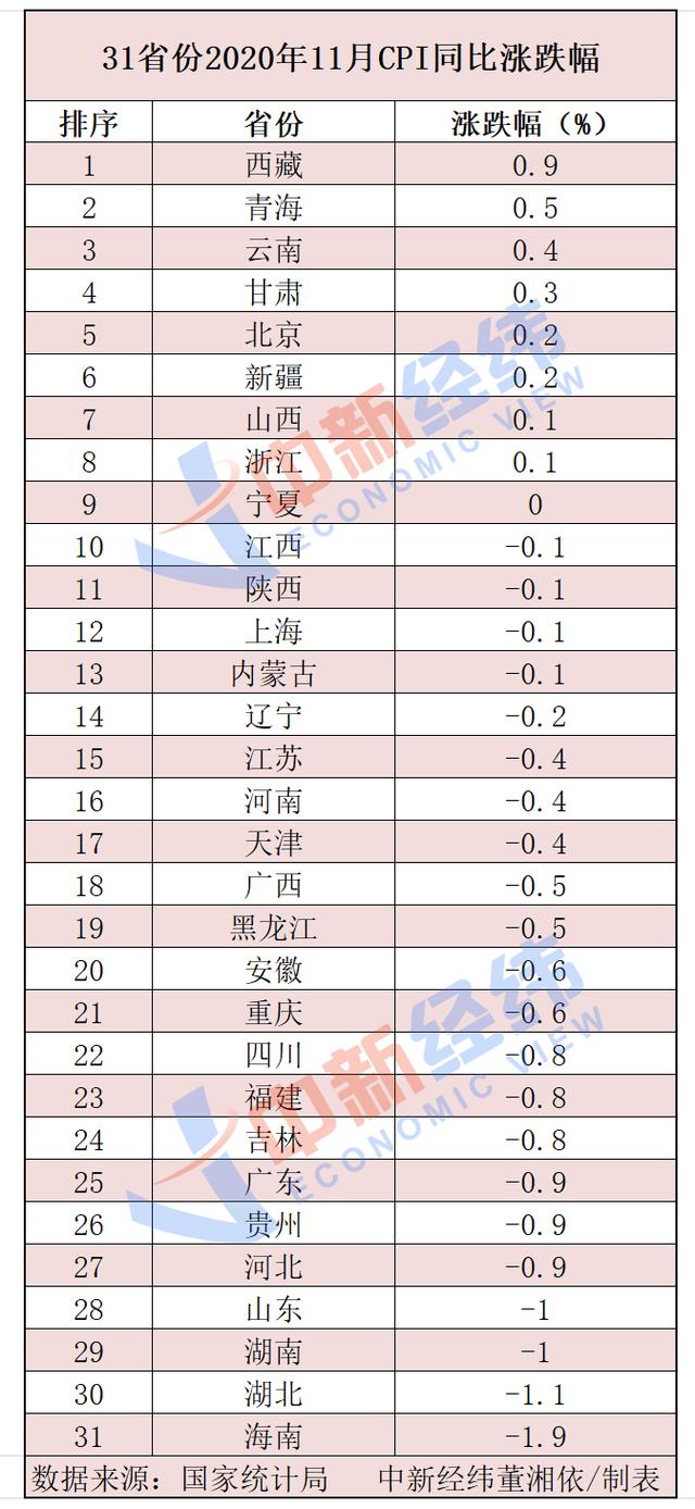 17省份CPI涨幅数据超过了全国水平,其中,西藏、青海、云南、甘肃、北京、新疆、山西、浙江这8个省份的CPI为正增长,西藏CPI以0.9%的涨幅数据高居全国榜首。广西、黑龙江两个省份CPI涨幅与全国持平,均为-0.5%。此外,江西、陕西、上海、内蒙古为-0.1%,江苏、河南、天津均为-0.4%,微微高于全国水平,宁夏CPI涨幅为0。