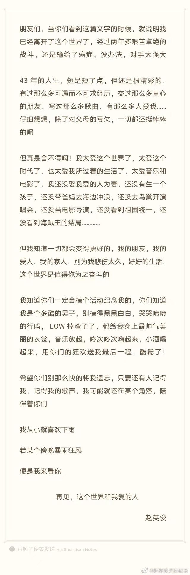 但是很明显,人们这么喜欢他,除了“良好的合作者”,大家还从他身上感受到了另一种可贵的品质,那就是对音乐和生命发自内心的喜爱。这一点在他留给世界的最后一篇文字中表现得淋漓尽致。