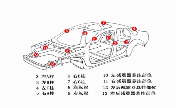 参照图所示车体部位,按照表二要求检查车辆外观,判别车辆是否发生过碰撞、火烧,确定车体结构是完好无损或者有事故痕迹;
